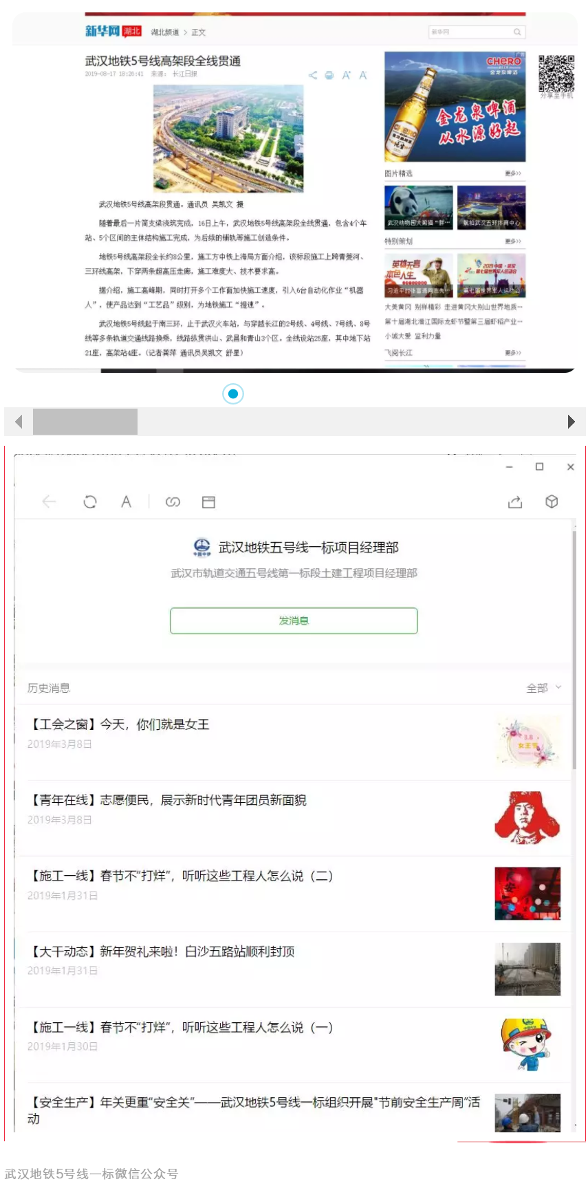 武漢地鐵5號(hào)線一標(biāo)項(xiàng)目黨支部成立了由項(xiàng)目書記為組長的宣傳工作領(lǐng)導(dǎo)小組,組織制定了項(xiàng)目宣傳工作年度計(jì)劃及獎(jiǎng)懲辦法。在《中鐵上海工程》報(bào)投稿工作方面,每月制定宣傳工作總結(jié)和下月工作計(jì)劃,截至目前已在《中鐵上海工程》報(bào)上刊稿6篇。在對(duì)外宣傳工作方面,在重大節(jié)點(diǎn)、人才培養(yǎng)、企業(yè)文化等方面深入挖掘,此外,黨支部還創(chuàng)辦了“武漢地鐵五號(hào)線一標(biāo)項(xiàng)目經(jīng)理部”微信公眾訂閱號(hào),每日上傳施工日?qǐng)?bào),并結(jié)合施工生產(chǎn)、黨建工作及企業(yè)文化等方面情況,開辟了大干動(dòng)態(tài)、黨群園地、信息速遞等欄目,第一時(shí)間推送微信信息,將微信公眾號(hào)打造成了展示項(xiàng)目文化的“窗口”。
