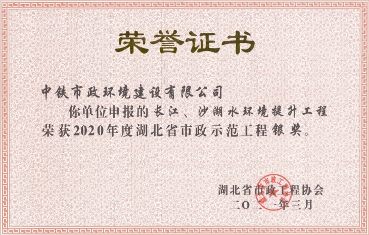 近日,2020年湖北省市政示范工程評(píng)選結(jié)果公布,公司長江、沙湖水環(huán)境提升工程項(xiàng)目喜獲湖北省市政示范工程銀獎(jiǎng)。