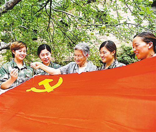 6月30日,中國歷史文化名村河北省沙河市王硇村開展“同心共筑中國夢 紅色基因永傳承”主題活動,一位60年黨齡的老黨員帶領女子民兵班的民兵,一針一線將中國共產黨黨徽繡在鮮艷的紅旗上,以表達對黨的無限熱愛、對祖國的美好祝福。趙永輝攝